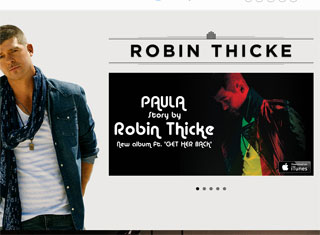 view: robinthicke.com more: Music Web Design Examples learn about: Music Web Design for info & quotes: contact DreamCo Design Great site that is that is full of features which include embedded pictures, videos, and a great horizontal menu. It looks just as sexy as Robins' music. An overall nice layout for a music website.